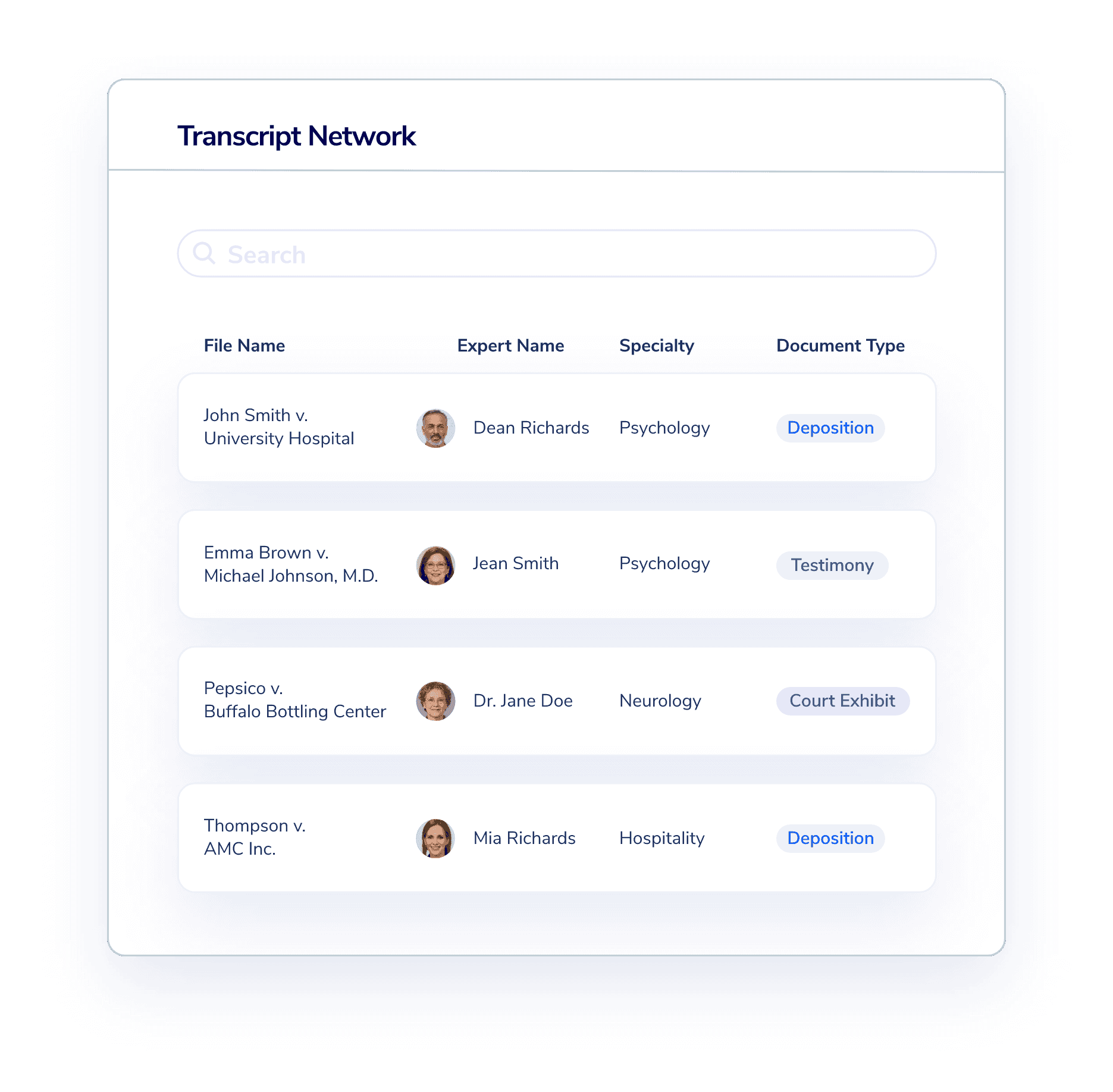 Upload transcripts from past cases to earn credits you can use to source transcripts on your retained or opposing experts. Explore our expanding database of deposition and trial transcripts, expert CVs, reports, affidavits, court exhibits, filings, and more.