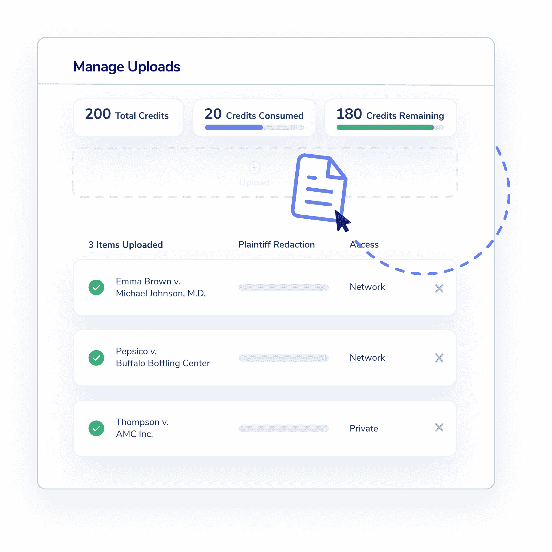 Use your credits to access transcripts and court records uploaded by other plaintiff attorneys.